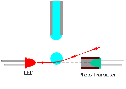 図1において,液滴がフォト・インタラプタの間を通過するとき,光源からの光が液滴で屈折するので受光部のフォトトランジスタの出力電流が変化する。この変化をとらえて滴数を計数する。