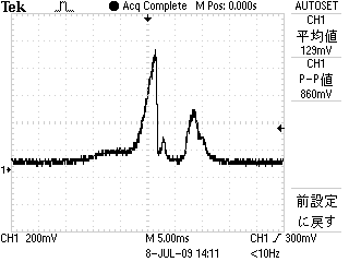 図3はフォトトランジスタの出力電圧をオシロスコープで観測した波形である。液滴の前縁と後縁で屈折が起こり二つの電圧ピークが現れると予想したが前縁の電圧ピークは微小なものであった。