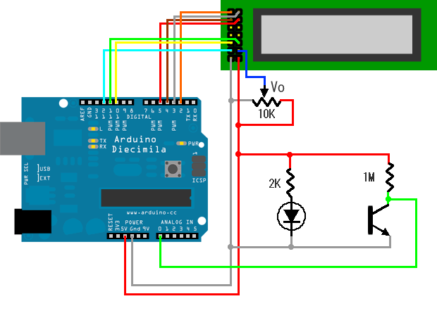 フォト・トランジスタの出力電圧をArduinoのアナログ端子に加える。