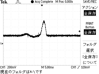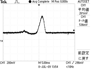 図3はフォトトランジスタの出力電圧をオシロスコープで観測した波形である。液滴の前縁と後縁で屈折が起こり二つの電圧ピークが現れると予想したが前縁の電圧ピークは微小なものであった。