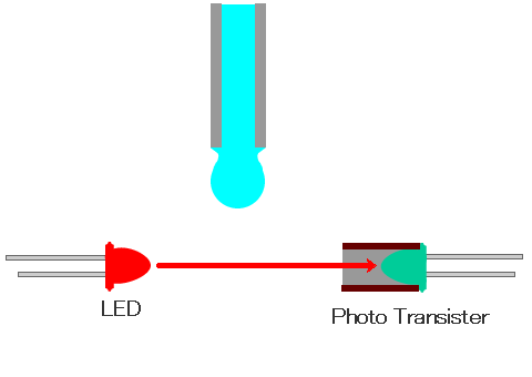 図1において,液滴がフォト・インタラプタの間を通過するとき,光源からの光が液滴で屈折するので受光部のフォトトランジスタの出力電流が変化する。この変化をとらえて滴数を計数する。