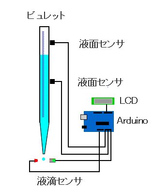 また,この滴数計数装置にpHセンサーや電磁弁を組合わせれば中和滴定などの自動化にも応用できる。