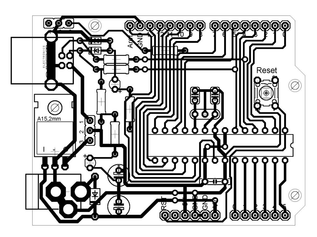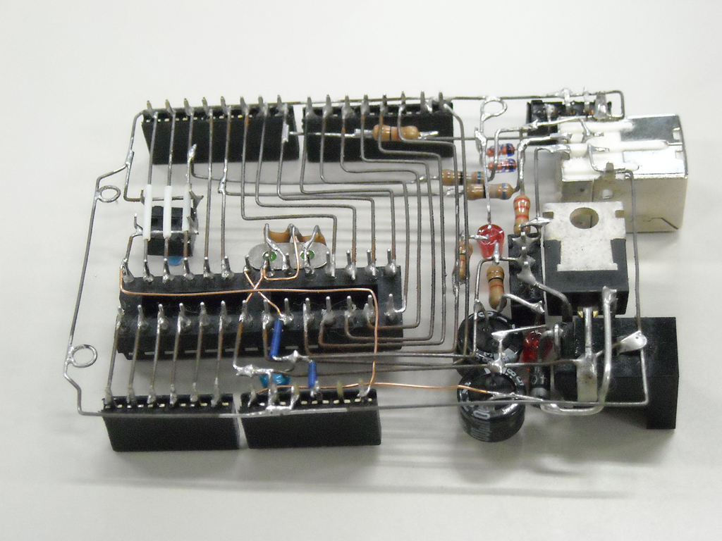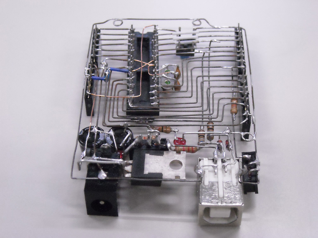 これはMetaboardの回路を使っています。MetaboardはソフトウエァUSB(V-USB)をブートローダに持っていて,スケッチはUSBaspプロトコルでArduino-IDEから直に書き込みます。