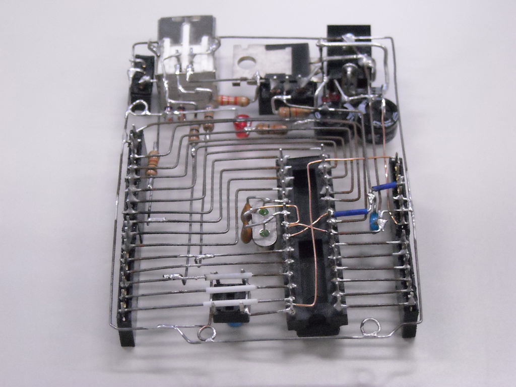 また,ピアノ線は弾性が大きいので多少曲げてもで元にもどるので大丈夫です(配線を曲げたりひねったりして実演)