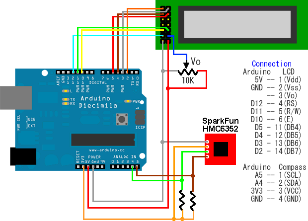 SparkFunのデジタルコンパスモジュール(データシート)をArduinoに接続する。