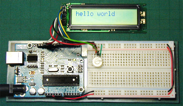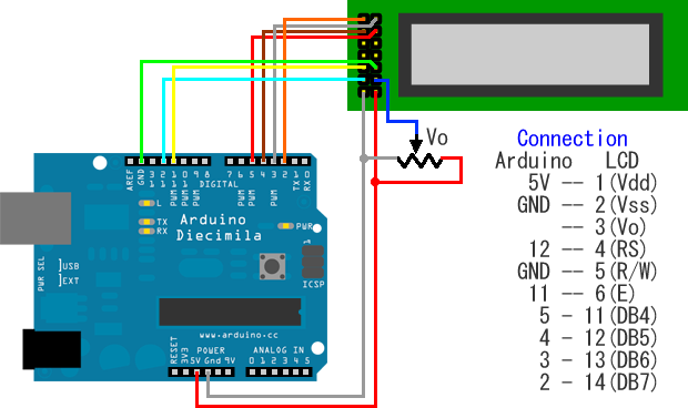 Arduino開発環境 には LiquidCrystal ライブラリが標準で組み込まれているのでこれを使う。
