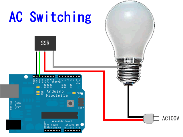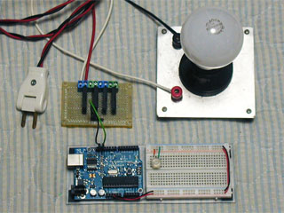 AC100Vデバイスをブレッド・ボードに配置してテストするのは危険。特にDiecimilaのロジック系回路とAC100V回路を 同一ブレッドボード上に混在させ,誤ってAC100V系の回路をロジック系回路に短絡させると十中八九 Diecimila が壊れる。 AC100V系回路は別基板にはんだ付けで作成し,かつ,はんだ面をアクリル板などで絶縁して短絡防止するのが鉄則。 AC100V電源の破壊力を侮ってはいけない。