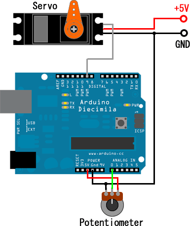 最近リリースされた開発環境 Arduino-0012 には Servo ライブラリが標準で組み込まれているのでこれを使う。
