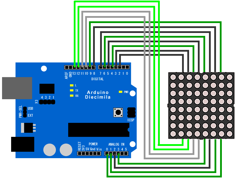 秋月の8X8 LED Matri(38x38mm)をArduinoで直接ドライブしてみた。