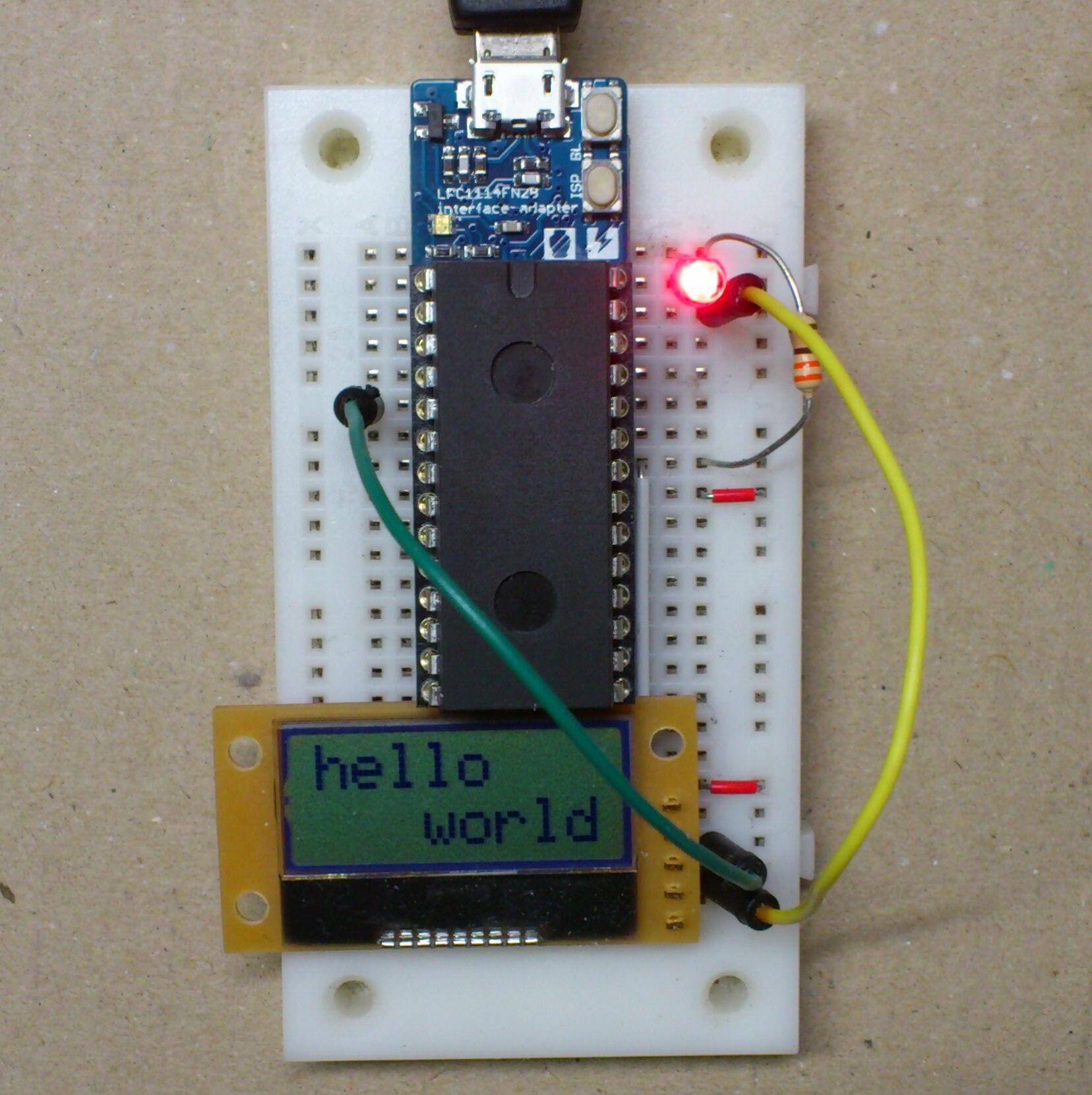 さっそく,壷印mbedにLEDとI2C-LCDをつないでLチカとhello worldをやって見た。簡単にLPC1114FN28のプログラムをコンパイルして実行できる。便利!