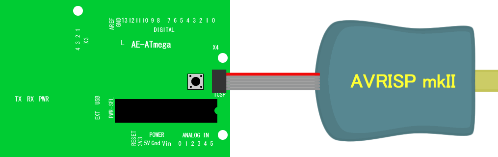 図8のようにAE-ATmegaとAVRISPmkIIを接続すればIOボード上のATmegaデバイスにスケッチを書込むことができます。IOボード上のデバイスにはブートローダを書込んでおく必要はありません。(IOボードには外部から電源を供給しておきます)