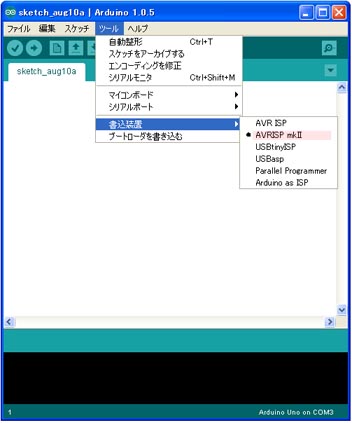 書込み装置の選択 Arduino IDEのメニュー[ツール]->[書込装置]を開き 一覧表から AVRISP mkII を選択します。