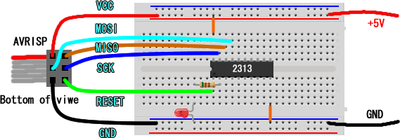 配線接続 図3のようにLED点滅回路を組み,AVRISPコネクタとATtiny2313を接続します。 AVRISPmkIIのVCCは電源供給ではなく電源電圧検出用なので,別ラインでブレッドボードに電源(+5V/GND)を接続します。