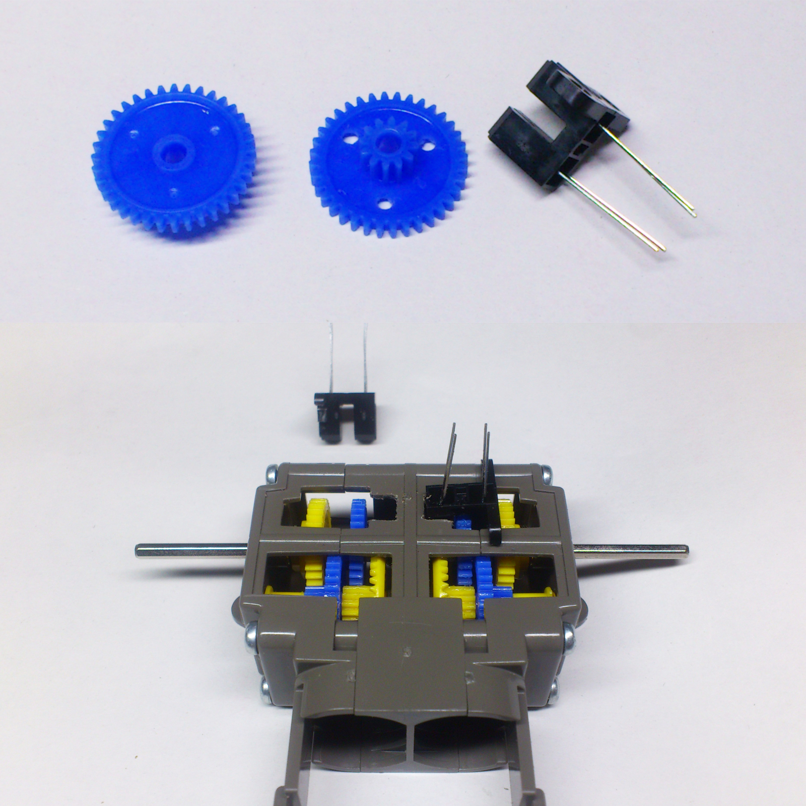 二輪倒立振子の位置補正のためにタミヤ・ギアボックスに簡単なローターリーエンコーダを組込んでギアの回転数(∝車輪の回転数)を検出したい。