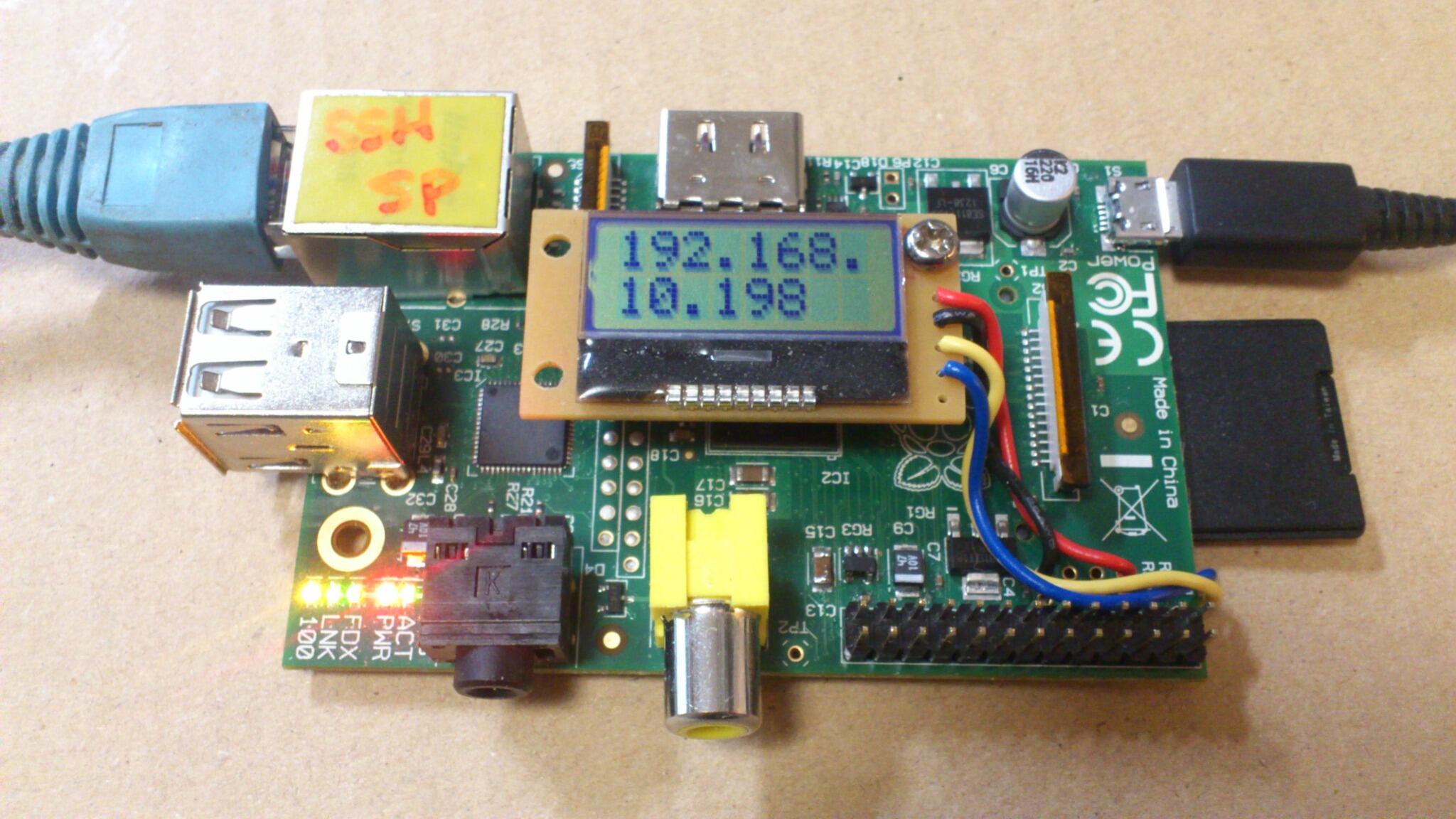 Raspberry Pi で遊んでいる。Pas-Piにはディスプレイやキーボード,マウスなどは接続せず,sshやvncで遠隔操作している。このような環境で,IPアドレスをDHCPでもらって来るように設定していると,Pas-Piに割り振られたIPアドレスを調べるには,DHCPサーバのIP割り当て状況を見たりする必要があり少々面倒… と,いうことでPas-PiにLCDを載せてRas-Piが取得したIPアドレスを自動表示する仕掛けを作る。
